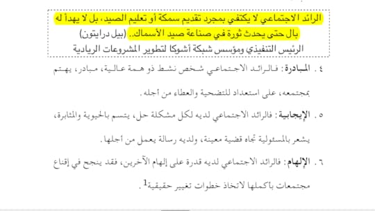 الكتاب رائع جدا منذو زمن طويل وانا ابحث عن معنى تلك الكلمة بالعربيه اراها فى مواقع التواصل الاجتماعى ولا ادرى ماهى ابحث فى القاموس ولا اصل الى طريق الى ان اهتديت لذلك الكتاب حمل فى طياته بحثا عن تلك الكلمه التى ابحث عنها هذا الكتاب ليس فقط فريد من نوعه بل انه موثق ايضا لقد كنت منذوصغرى اتسائل هل حقا يولد المرء عظيما او رائدا ؟ام ان الحياة هى من تعطيه كل ذلك بعد ان يدفع الثمن ؟ كنت اتسائل هل حقا يمكن ان يتغير شيئا فى هذا العالم لقد وجدت اجابات على تساؤلات كانت تعترنى ولا اجد لها اجابات الى اولئك الذين اكتفوا بنقد العالم من وراء شاشات التلفاز اولئك الذين سخطوا على البشريه اولئك الذين يهمهم امر الانسانيه اولئك الذين يبحثون لهم عن مكان فى الارض ولا يعرفون كيف ؟هذا الكتاب ياخذ بايديكم الى الطريق يعطيكم شمعة لتواصلواوسط النفق المظلم الطويل كانت قصة سكوت هاريسون وقرية تفاهنا الاشراف واكادمية الحفاه من اكثر القصص التى ادهشتنى تقول لنا الكاتبه ان الرياده المجتمعيه لا تعتمد كثيرا على المهارات الفرديه بقدر ما تعتمد على المهارات الرياده ابداع مبادره وخلق فرص وتفاصيل رائعه تذكرها الكاتبه