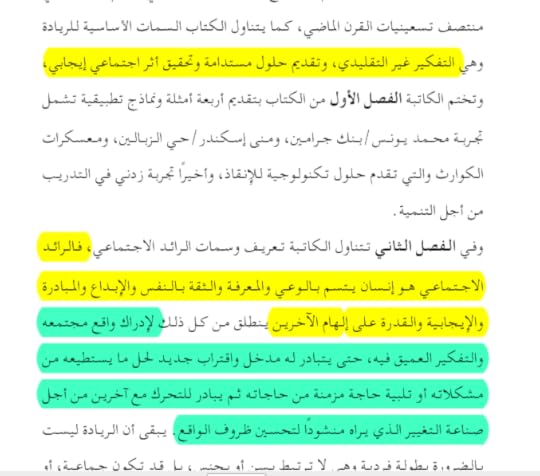 كتاب تحدث عن مفهوم الريادة الأجتماعية وهى عبارة عن إيجاد حلول للمشكلات المجتمع والتغيير فى المجتمع لأحداث تغيرات جذريةحول ثلاث مكونات (الأبداع،المخاطرة،اقتناص الفرص) السمات الأساسية للريادة المجتمعية أنها فكر غير تقليدي ، تقدم حلول مستديمة،تخلق أثر إجتماعي إيجابي ملحوظ المجتمعات محرومة ما تعتمد على المهارات الرياده ابداع مبادره وخلق فرص ويتميز الرائد الاجتماعي بأنه يفكر خارج الصندوق و يثق بقدراته على إحداث تغيير حقيقي و ملموس. وظهر الوقف على مدى تاريخ الأسلام فقامت المؤسسات الخيرية فساندت الحكومة فى توفير مايحتاجه المجتمع بدون إثقال الدولة ووذكرت الكاتبه أمثلة على الريادة الأجتماعية أمثال *هنري ديورانت مؤسس الصليب الأحمر،ومحمد يونس مؤسس بنك جرامين *مبادرةSEED : هدفها هو العمل فى مجال التنمية المستدامة والحفاظ على موارد الطبيعه *أكاديمية الحفاة (Barefoot College) وهدفها تحويل وتدريب العاطلين عن العمل إلى اطباء ومهندسين بدون الحصول على شهادة الجامعية وضمت مشاريع كتنمية المرأة واستغلال الطاقة الشمسية * اكتشف د. عبد الرحمن السميط أوضاع مريبه للمسلمين فى أفريقيا فأنشأ جمعية العون المباشر هدفها الدعوة إلى الله من خلال التنمية -تجربة قرية (تفهنا الأشراف) (مبادرة المهندس صلاح عطيه وإدخارسهم الشريك الأعظم وتطويعه للعمل الخيري _بنك الطعام المصري : لمكافحة الجوع عن طريق الحفاظ على فوائض الطعام وهناك بعض يشرف لتأكد من جودة الطعام