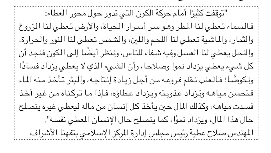 أختم باقتباس من الكتاب للمرحوم بإذن الله المهندس صلاح عطية: "توقفت كثيرًا أمام حركة الكون التي تدور حول محور العطاء: فالسماء تعطي لنا المطر وهو سر أسرار الحياة، والأرض تعطي لنا الزروع والثمار، والماشية تعطي لنا اللحم واللبن، والشمس تعطي لنا النور والحرارة، والنحل يعطي لنا العسل وفيه شفاء للناس، وننظر أيضًا إلى الكون فنجد أن كل شيء يعطي يزداد نموا وصلاحا، وأن الشيء الذي لا يعطي يزداد فسادًا ونكوصا؛ فالعنب نقلم فروعه من أجل زيادة إنتاجه، والبئر تأخذ منه الماء فتحسن مياهه وتزداد عذوبته ويزداد عطاؤه، فإذا ما تركناه من غير أخذ فسدت مياهه، وكذلك المال حين يأخذ كل إنسان من ماله ليعطي غيره ينصلح حال هذا المال، ويزداد نموًا، كما ينصلح حال الإنسان المعطي نفسه".