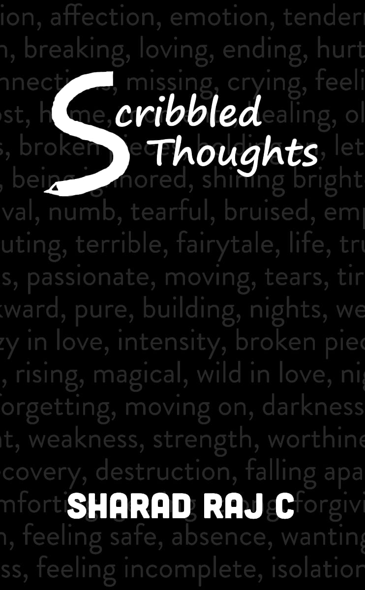 SCRIBBLED THOUGHTS: Sharad Raj C Scribbled thoughts is a collection of poems penned by Sharad Raj C. this book vividly covers all the moods and phases of relationship beautifully with each poem. The language of the book is simple yet its content is deep rooted and each and every poem is profoundly moving. The cover of the book totally justifies the content of the book, if you look closely one can see shadowed words and these words individually are zest of one poem or another. Sharad’s expression of love is simple and realistic and reflects true nature of an individual. I have connected with a few of his poems as if they were narrating my own tale such as “I will love you until there is love left in me”. He has divided his book in three section i.e. the phase of love. 1. Loving: this section contains different aspects of one’s life when in love some beautiful poems gently describes love from different perspective. My favorite being “from a girl to her boyfriend”. 2. Breaking: the second part of cycle of love where Sharad takes us on journey beyond love to all the miseries pain and anguish. “every time I thought you left, you came back. Every time I thought you will stay you left.” and “ we go behind people who don’t want us and they go behind people who will leave them soon.” Sharad reminds us the repercussion of love with his poems. 3. Healing: post love and breaking we definitely need some repair and writer does his job perfectly. I particularly liked this section as it was full of positivity and regaining self-importance and we go past venerability. “After days and days of breaking She finally found love She finally found the whole goddamn universe In no one but herself.” Sharad Raj C’s book is likable and leaves a soothing effect