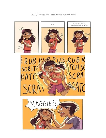 Her dad comes to school to pick her up early for her allergy shots, and Maggie accidentally ignores a boy’s wave in the hall. There’s just so much on her mind… her dad calls her ‘his favorite daughter’, but when she sees the car seat, something hits her. If the baby is a girl, he won’t say that anymore, will he? Feeling down, Maggie gets the shots, and goes out to get ice cream with her dad afterwards. But at home, doing her math homework, she can’t focus… She’s just too itchy! She gives in, scratching her arms, and overwhelmed by the sound of Claire playing with her puppy outside. However, when she math problem blows away, and she goes to catch it, she sees something strange through a crack in the fence… Claire is crying? She hadn’t that maybe Claire missed being friends, and playing together… it wasn’t just about her. I liked this. Maggie doesn’t have ‘main character syndrome’, and sees the pain that others go through, as well. She summons her courage, and goes to Claire’s house. Claire and her have a heart to heart, and Claire explains that she didn’t know the shots wouldn’t cure Maggie. They go to hang out at Maggie’s house, and Claire gives her an idea… What if she got a mouse?