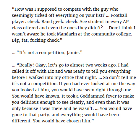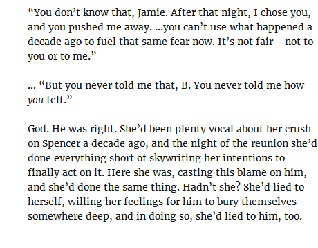 “You’ve had almost two weeks to tell me how you felt, but instead you’re more worried about protecting yourself. You’re exactly the same guy you were ten years ago. You may be keeping yourself safe from getting hurt, Jamie, but all you’re doing is breaking my heart again. I thought I’d made you a cheater. I thought you’d made me a home wrecker. ... I get how scared you were then. I really do. But this is now. We’re adults, and I don’t want to play games anymore. What does it matter how we might feel if you can’t be honest with me?”