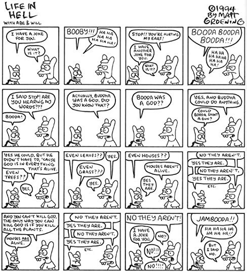 You couldn't ask for a better comic duo than Will and Abe. When the overly dramatic, death-obsessed spinner of improvised monster stories is the straight man, you know your comedy team is something special, and imagine Matt Groening's pride at having played an integral role in bringing this comedy team into the world, and imagine his relief at the discovery that all he had to do from now on was eavesdrop on his kids fighting in the next room in order to produce hilarious, effort-free comic strips.