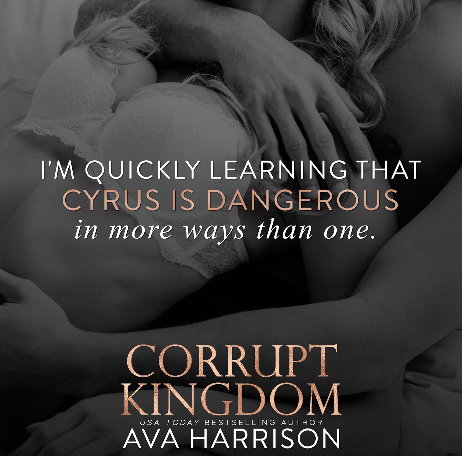 I loved Corrupt Kingdom. Dark anti-heroes, villains, what have you, can be even more fascinating than purely good characters, and Cyrus is beyond fascinating. He's got darkness in his soul for sure, but he's not irreparable, especially once he becomes entwined with Ivy. I love how Ivy really got him, could see through to the goodness inside of him, but that he didn't completely change, rather just allowed some of her light to lighten some of the heaviness inside him. Ava Harrison always writes layered, interesting characters, but I truly think Cyrus is her most interesting, most complex, most lovable character yet. Thank God she gave him a woman his equal, someone to love all of him just the way he was.