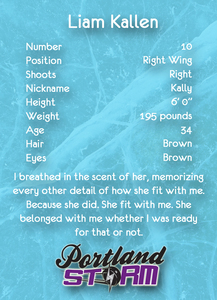 After losing his wife in a tragic accident, Liam Kallen gets traded from the NHL team he has been on for years to the Portland Storm. Shortly after arriving in town, he sees a woman on the side of the road in a potentially dangerous situation and can't help but try to prevent the unthinkable from happening to her. He couldn't protect his wife, but he will do everything he can to protect this woman. He convinces her to let him help, and shortly after things go from bad to worse for Noelle Payne when her car ends up getting destroyed in an accident. Without Liam's help, she would have not just lost her car but also her life. When Liam finds out that she was living out of her car and is now without a home, car or job, he tells her to come and stay with him for awhile. She reluctantly agrees, and decides to take him up on his offer. Soon Liam is going out of his way to protect and provide for her in the only way he knows how. Noelle is determined to make it a short time though and continues to search for a way for her to make a difference in the world. As Liam and Noelle grow closer, he begins to heal from the painful death of his wife while finally looking towards the future for the first time. But can Noelle stick around long enough to see if they have a chance at a future together, especially when she knows that he is still not opening himself up to her completely?