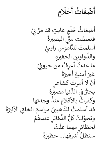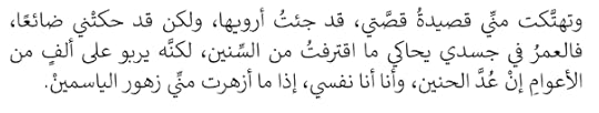 أقتبس: " عندما كنتُ صغيراً أرّقتني كلّ أنواع المسائل و رمتني من سطوح الانفعال كل كشفٍ هو جرف كل فتح لا يزال يذرف الدمع و يأبى الانشغال و أنا ما زلت غرّاً ألحق الأسباب في سوق الجهال"