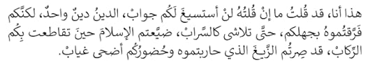 "ما زلتُ أحمل صولجاني صائحاً بين الحشود، هذا الذي تدعون ديناً خالصاً، ما عاد موجوداً هنا، تيه تقمص تائهاً في تيهه، و مضى يدوّن ما نفاه المرسلون."