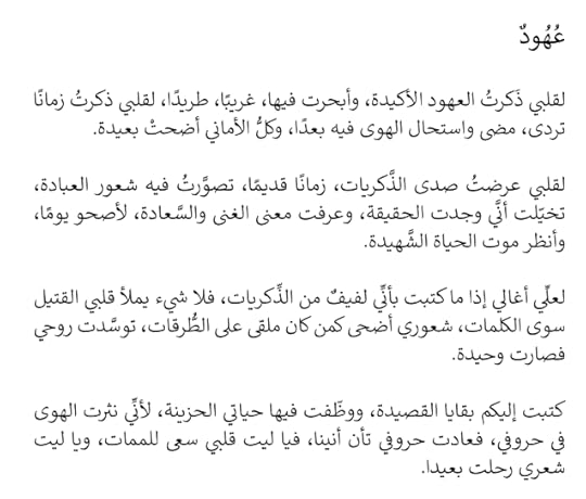 {أقاتُلُ الإغواءَ كلَّ دقيقةٍ، قد خفتُ شيطاناً يلوثُ حاضري، وإذا تصرَّمتِ الحقائق كلُّها، ألفيتُ شيطاناً يعيشُ بداخلي، ويزيِّنُ الإيمانَ دون فضائلٍ، ماذا يسيءُ إنِ امتطيتَ أجساد الحِسان بوارِقاً، وعدَوتَ للسَّطر الأخير.} . {يا أيُّها الإنسانُ هل تدرك بِجُرمك أن تعيشَ مُشَّوَّهاً، ومُشَوّّهاً تلقاكَ أسبابُ الغيابْ، يا أيُّها البطل الذي مادتْ دروبُ مَسيرِهِ، حتى استطابَ العيشَ في وادي الذئاب.} . {هذا أنا، قد قُلتُ ما إنْ قُلتُهُ لنْ أستسيغَ لَكُم جوابْ، الدينُ دينٌ واحدٌ، لكنَّكم فرقتُموهُ بجهلكم، حتى تلاشى كالسراب، ضيَّعتم الإسلامَ حينَ تقاطعت بِكم الرِّكاب، قد صِرتُم الزَّيغَ الذي حاربتموه وحُضورُكُم أضحى غياب.} . {جناحُ البعوضةِ يعجَزُ عنّيْ.. أنا لن أطيرَ بِحُلمٍ.. فكومةُ لحمٍ أنا ما أزال.. أتوقُ لِأنهضَ دونَ الرمال.. وأبقى لنفسي الغريمْ.} . {أقاتُلُ الإغواءَ كلَّ دقيقةٍ، قد خفتُ شيطاناً يلوثُ حاضري، وإذا تصرَّمتِ الحقائق كلُّها، ألفيتُ شيطاناً يعيشُ بداخلي، ويزيِّنُ الإيمانَ دون فضائلٍ، ماذا يسيءُ إنِ امتطيتَ أجساد الحِسان بوارِقاً، وعدَوتَ للسَّطر الأخير.} . #قليل_من_الشعر_أو_شيء_يُشبهه #الكتاب_هو_المنفى_الذي_يأويني_بين_سطوره #اخترتُ_مُتنفسي_بين_كتاب_وقلم #القراءة_حيوات_أخرى_نعيشها #رباب_تقرأ