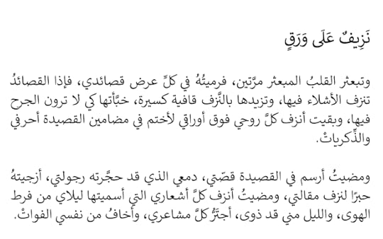 كلام جميل رقيق، وأنا أتعثر بجميل ورقيق الكلام. كانت تجربة قرائية فريدة من نوعها، لأول مرة أقرأ كتاباً "شعرياً"كاملاً، وأتمنى أن لا تكون الأخيرة.