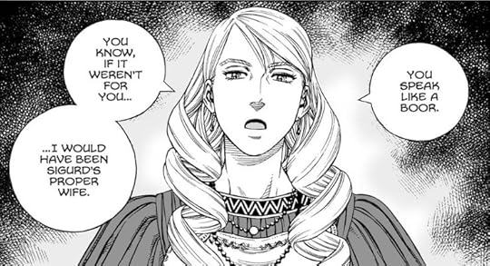 Almost a five star read. Finally, the story actually progresses. A time skip is employed to have the actual work of recruiting new people and seeing the beliefs of the crew continue, as they almost embark to Vinland. There is actual character growth and some heartwarming moments, some of which actually employ good comedic timing, for once. There is some small, albeit heavy handed inclusion for a character who is not gender typical. Nice to see, regardless.