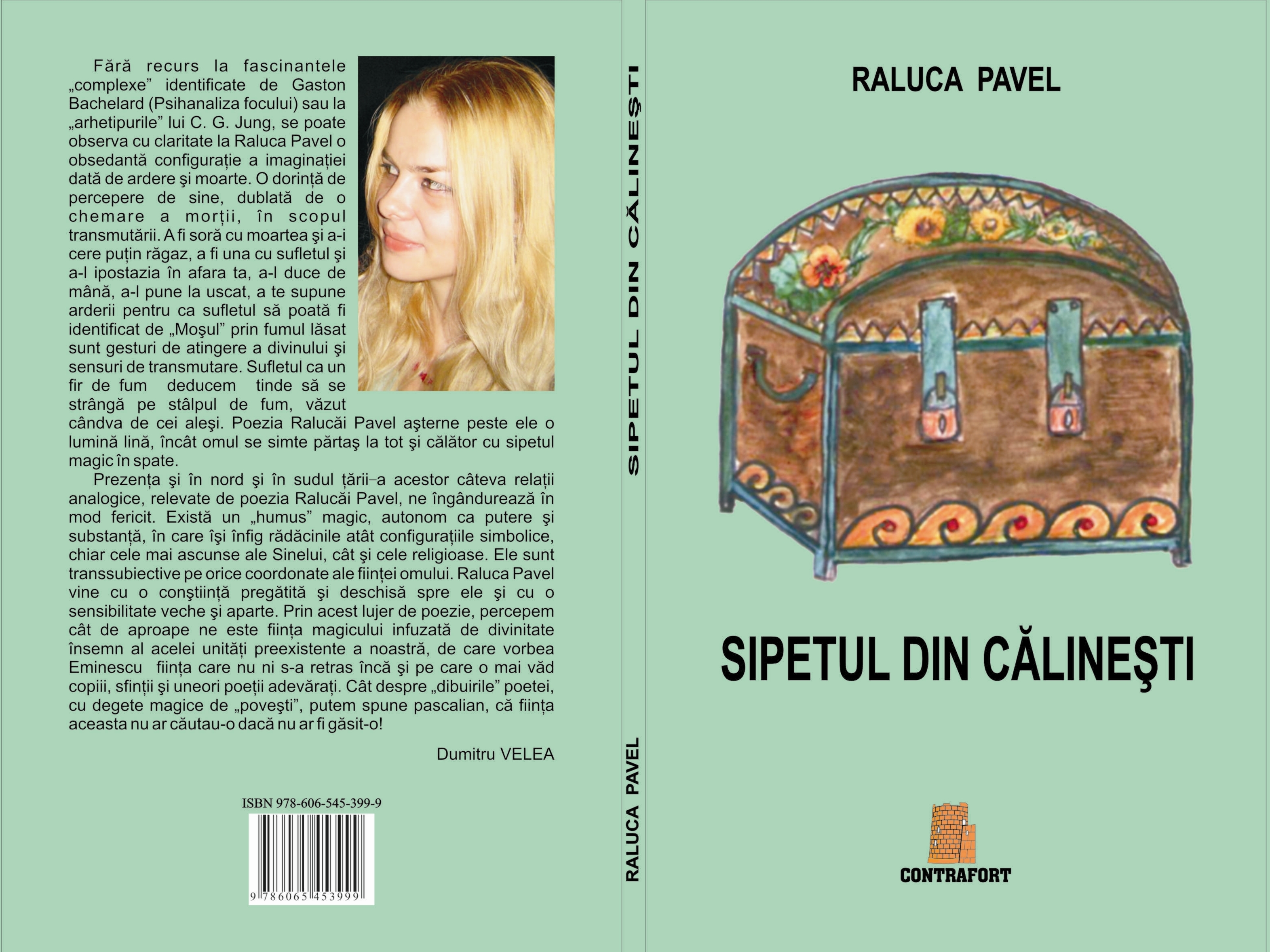 "Cu volumul "Sipetul din Călineşti", pentru Raluca Pavel, are loc botezul cuvântului, moştenit de nu se ştie din ce zori de zi şi pe care ea îl trece prin apele sfinte ale amintirii şi-l aduce, sfioasă, să înflorească în casa poeziei. Între „semenul alunecat” pe clina aparenţelor şi recuperarea copilăriei ca realitate magică şi divină a omului – ce cale de străbătut! Ea zice un „drumuşor” spre a apropia copilăria, mai bine spus, spre a se apropia de fântâna cu ape şi suflet a acesteia. Descoperim, ca într-un luminiş, pe sub zilele grele de interese şi inconsistenţă, părţi din fiinţa magicului şi simbolicităţii prin care clipesc ochii lui Dumnezeu. Din această fiinţă care ne împrejmuie, ne acoperă şi ne hrăneşte cu suflet şi eternitate. Pentru o clipă se întrevede cum văzutele se întorc spre cele nevăzute. Spre izvor, spre sufletul fântânii, ca să folosim titlul unei poezii. În orizonturile poeziei sale se disting elemente şi analogii ce ţin lumea să nu se destrame. Un copac devine flacără, fără să se consume; un suflet se ridică în fum fără să se prefacă în colb; un munte aprinde degetele ce îl sculptează şi preschimbă făptura creatorului în nevăzut. Dar ca să vezi omul nedesprins din existenţa magică şi simbolică, mişcându-se printre analogii, fără să ia în seamă cauzalităţile limitatoare, trebuie să ai ochii şi candoarea copilului. Raluca Pavel aduce pâlpâiri de stări şi percepţii din zonele cele mai „pierdute” ale memoriei, ale copilei de câţiva anişori, după simţurile şi privirea căreia pare a lua chip lumea. Lumea ce i se arată ca un ciorchine magic. Este ajutată şi de bunici s-o vadă astfel. Cu un strop de real în visare. Sau invers. Îi vin în întâmpinare locuri şi oameni, cei vii şi cei petrecuţi dincolo, Călineştiul şi conacul boierilor Miclescu, căminarul Gheorghe Eminovici cu ursita sa, până şi păsările şi plantele, drumuşorul şi fântâna, casa cu uşa secretă, toate îi şoptesc ca-n basme. Dinspre prezent spre această zonă, poeta are un spaţiu larg de cuprindere şi însufleţire a lumii. Lumea rezonează în această copilă şi simţurile copilei o desăvârşesc. Totul este văzut şi nevăzut, toate se leagă prin analogii, ca să ne restrângem la una dintre modalităţile de cunoaştere proprie magicului." (Dumitru Velea, din Prefață)