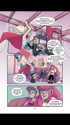 I like that there are graphic novels coming out that are geared towards middle readers and up, with strong female protagonists who aren't dressing in gravity-defying ways. This book had strong female friendship in it AND a happy family life with both parents. Usually the MC is an orphan or missing a parent, so it's nice to have both parents in the picture AND happy together.
