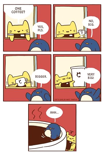 I've been a fan of Cat's Cafe since my barista friend introduced me to Tarpley's instagram a few months ago. After having seen his adorable, uplifting, and hilarious 4-8 panel comics, I knew I had to download this from NetGalley! And what a great decision it was, because Tarpley's comics are just adorable. From Cat's Cafe's beginning to the friendships all the characters have made, this comic collection makes for both a creative and sweet outlook on what it means to not only be a barista, but to be a part of a community.