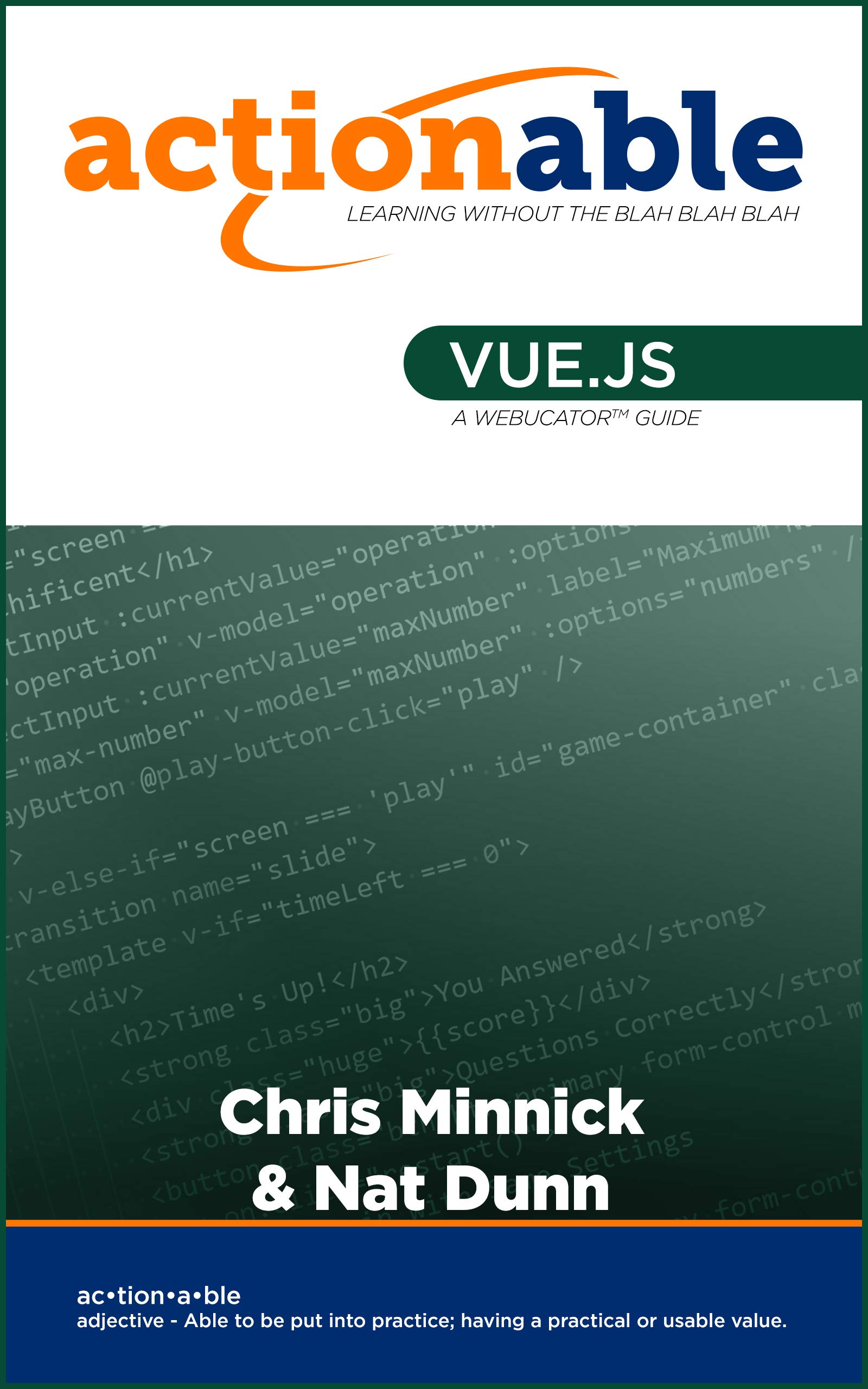 This is a hands-on, practical guide for learning Vue.js. We assume that you know HTML and JavaScript pretty well, and that you’re comfortable with CSS, meaning that you know what CSS rules are and how to apply them with classes and styles. We start the book off with a lesson on some of JavaScript’s more advanced features, many of which we use throughout the course. You should, at the very least, page through that lesson to make sure you’re familiar with those aspects of JavaScript. From there, we jump into Vue.js. You’ll start off with a simple “Hello, Vue!” app, and then, throughout the book, we’ll walk you through creating a small, but featureful math app. This will give you the skills you need to build many different types of Vue.js applications. When reading this book, you should be sitting at your computer. When you first begin, plan to spend at least two uninterrupted hours. You should do your best to get through lesson 3 in the first sitting. That will get you through the foundational learning. From there on out, you’ll be hopping back and forth between the book and viewing, editing, and writing code on your computer. Go through the book slowly and methodically. Read every demo carefully. Work through every exercise. You cannot learn to code through reading alone. You must practice. So, get ready for some hard work and some good fun!