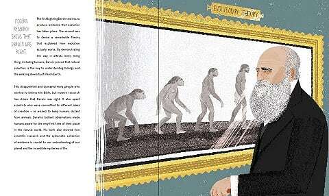 There is a fair amount of detail about the Theory of Evolution, enough for a young audience to understand what it means and how it differs to the theories pre-Darwin, without commenting on validity and arguments. Key examples (finches) are here, that show the pertinent points that gave Darwin reason to think deeply about what he was seeing on his 5-year round-the-world voyage.