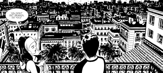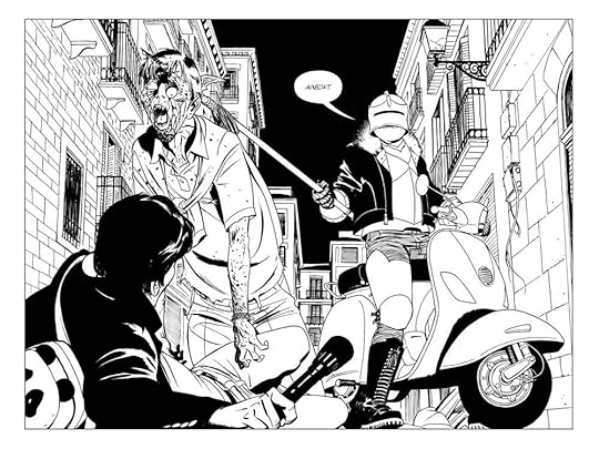 LO BUENO: Salir de esos campos desolados y de carretera en Estados Unidos, en Barcelona, con el ARTE ( SI,en mayusculas) del mousntruo Marcos Martin que se marca unas paginas hermosas, en composición, diseño, personajes, escenografia...todo es hermoso.Ah, y hay un rasro de color, que creo que nunca habia aparecido en Walking dead, y queda muy lindo.