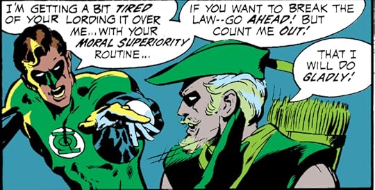 Dennis O'Neil and Neal Adams brought together two disparate green superheroes to try to draw out a moral tension between them. Green Lantern hews to a traditional privileged view on morality, implicitly trusting authority figures and upholding the status quo against "crime". Green Arrow, on the other hand, sees the structures of social inequality and exploitation as inherently criminal, and doesn't give a damn what the law has to say about it.