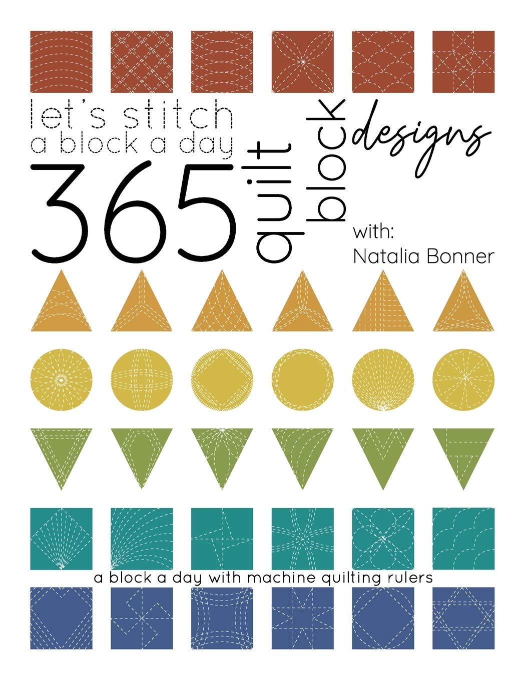 365 quilt block desings with machine quilting rulers. Well known machine quilter, author and teacher Natalia Bonner has created 365 unique quilt block designs. Each design is quilted on a 6" square, circle or triangle. Each block design has a unique QR code that links to a machine quilting video, where Natalia will walk you step-by-step through the process of machine quilting the block. Natalia uses her popular machine quilting rulers; 4-N-1, Inside Out, Trailer, Mini 4-N-1 and Mini Inside Out