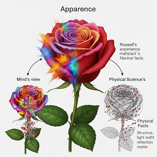 خامسًا: إن قطعة من المادة هي في حقيقتها مجموعة أحداث ترتبط بقوانين علية هي القوانين العلية الطبيعية، بينما العقل مجموعة أحداث ترتبط بقوانين علية هي القوانين العلية النفسية، وإذن فلا يصح وصف حادثة ما بأنها عقلية أو بأنها مادية لصفة في كيانها، بل توصف بهذا أو بذاك حسب سياقها العلي، فإنه من الممكن كل الإمكان للحادثة أن تتسق في كلا السياقين العليين، السياق الذي تختص به الطبيعة والسياق الذي تختص به السيكولوجيا، وفي هذه الحالة تكون الحادثة عقلية ومادية في وقت معًا، ولا صعوبة بعد اليوم في هذا أكثر من تصور إنسان ما خبازًا مرة وأبًا مرة أخرى، وما دمنا لا نعلم شيئًا عن الصفة الكيانية للأحداث الطبيعية إلا حين تكون أحداثًا عقلية تقع لنا في خبرتنا مباشرة، فلن نستطيع أن نقول إن العالم المادي خارج رؤوسنا يختلف عن العالم العقلي أو لا يختلف. ... مثال:- ((الوردة)) وجهة نظر العقل: الوردة تُدرك من خلال اللون والرائحة، وهما تجارب ذهنية أو إحساسات داخل العقل. وجهة نظر العلم الفيزيائي: الوردة عبارة عن ذبذبات ضوئية تنعكس عن سطحها، وحركة كمية في الذرات والجزيئات. نظرية رسل (الخبرة): الواقع يتكون من وقائع محايدة تتجلى في شكلين: كعقل (تجربة ذهنية) وكمادة (ظواهر فيزيائية). وهما وجهان لعملة واحدة، حسب السياق الذي يُنظر فيه إلى الظاهرة. *.*.*.*.*.*