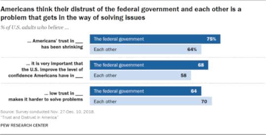 Most of us in the US would agree that we are living in a period of crisis, although we might disagree what that crisis is. Pete Buttigieg, a Democratic candidate for the presidency in 2020, identified that crisis as a crisis in trust – and made a compelling argument for that label. According to a Pew Research Center study, excerpted in Appendix A, a significant majority of respondents of Americans see trust in both the government and each other as shrinking but necessary. Its absence making it harder to solve problems. Buttigieg: "trust, often unseen, is indispensable for a healthy, functioning society. And in the absence of trust, nothing that works can work well" (p. 27).