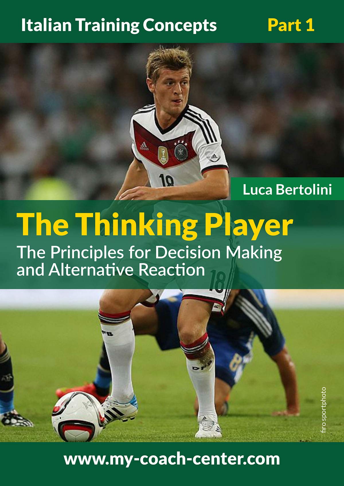 The training systems for the individual tactic of a youth player can be divided into two kinds. Every player can be trained for the specific role he will have inside a team during a match or he can be trained to be ready to be an attacker, a defensive or attacking midfielder or an outside forwarder depending on the specific situation he is in during a match. The training sessions for the first type of player must be repetitive and the exercises could be boring for him, since he must be constantly trained for one single role. The habits of this kind of player on the field could be fixed without any chance to be developed in his future. On the other side, a “thinking player” is crucial and more useful for his team as he can play at his best and as the situation requires on the field; his role will be specified when and if he is a first team player. The principles of play of football are always general and all the players shall know them and be prepared to carry them out on the field. Therefore, I created these exercises where all the roles are unknown at the beginning and they are decided by one teammate, by the goalkeeper or by the situation of the exercises while they’re being carried out on the pitch; all of them are organized on small sized pitches and they can be set up very fast. Every single player can be an attacker, can become a defender after an attacking move and a lot of transitions are always present; they must think quickly and they must find the best solution to adapt themselves to the situation. Few exercises have coordinative goals included. The most outstanding point of view in this ebook is that all the exercises require to score in big or small goals at the end of any move. Luca Bertolini Introduction 4 01: Countermovements, cut runs and 1 vs 1 6 02: Coloured 1 vs 1 or 2 vs 1 8 03: 1 vs 1 and following 1 vs 2 9 04: 1 vs 1 in succession and following 1 vs 2 10 05: 1 vs 1 decided by the goalkeeper and under time pressure or 2 vs 1 12 06: Two kinds of 1 vs 2 14 07: 2 vs 1 called by the goalkeeper or 1 vs 2 15 08: 2 vs 1 or 1 vs 2 16 09: 1 vs 1 called by the goalkeeper or 2 vs 2 17 10: 2 vs 2 called by the goalkeeper 18 11: 2 vs 2 decided by the first receiver 19 12: 2 vs 2 decided by the goalkeeper and the first receiver (1) 21 13: 2 vs 2 decided by the goalkeeper and the first receiver (2) 22 14: Shoot in the main goal or 2 vs 2 in 3 goals 23 15: 1 vs 1 under time pressure or 2 vs 2 24 16: 1 vs 1 and following 2 vs 2 (1) 25 17: Double 1 vs 1 and following 2 vs 2 (2) 26 18: Double passing sequence, 1 vs 1 and 2 vs 2 28 19: Clock passing sequence exercise, 1 vs 2 and 2 vs 2 30 20: From 1 vs 1 to 3 vs 3 (1) 32 21: From 1 vs 1 to 3 vs 3 (2) 33 22: 4 vs 2 or 4 vs 3 (1) 34 23: 4 vs 2 or 4 vs 3 (2) 36 24: Temporary 4 vs 2, 4 vs 3 or 4 vs 4 38 25: 4 vs 4 + 3 decided by the goalkeeper 40 26: 6 vs 4 with goalkeeper to switch play 41 27: 3 vs 3 and/or 6 vs 3 decided by the goalkeeper 42 28: 1 vs 1 or 3 vs 3 or 6 vs 6 decided by the goalkeeper 44
