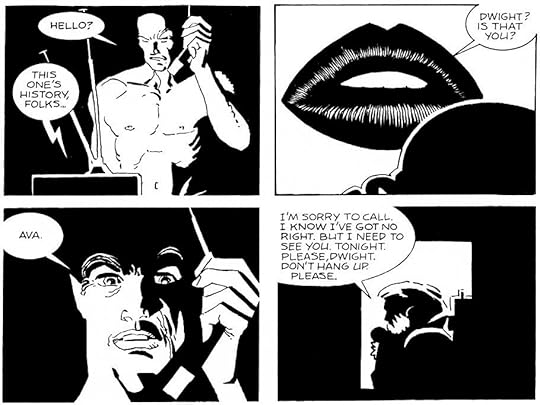The book is in black and white, and Miller uses light and shadows to full effect in all of the panels. Look at Ava Lord's entrance: first full page silhouette with hazy white smoke at the top, then close up, then look at Dwight's face, then close up still but not making out any features on the shadowy face, then the meeting, then straight into dialogue fresh from the 1930s. It's so cinematic!