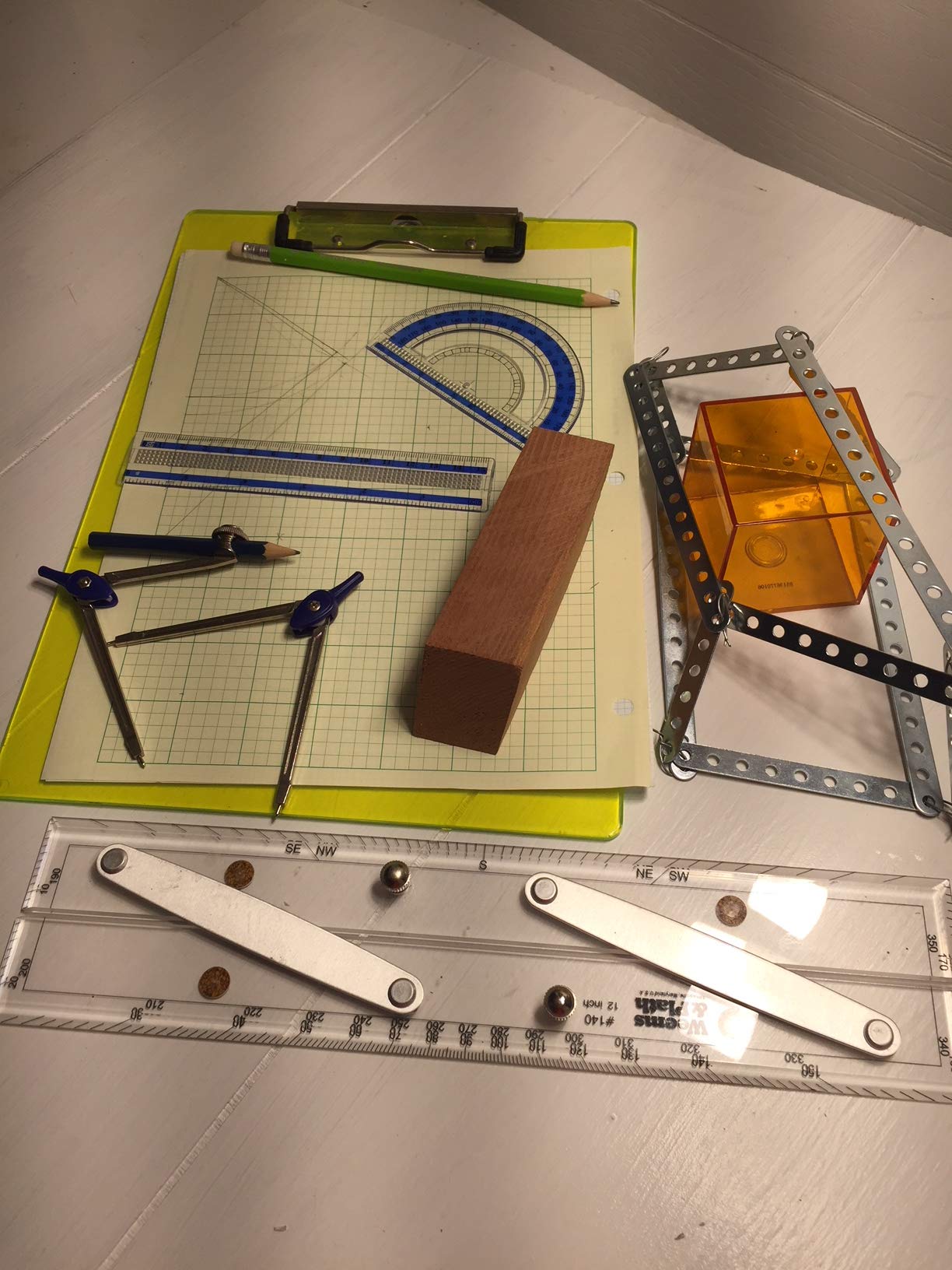Last revision was 6Feb2021. This is the last year of College for mathematics and we have to mostly summarize all of mathematics as best we can. And set a new pattern to prepare students going on to math graduate school. A new pattern of work habits, because graduate school is more of research and explore on your own. So in this final year, I am going to eliminate tests, and have it mostly done as homework assignments. Cover Again and again, many times in math, the mind is not good enough alone to think straight and clear, and you need tools to hands-on see how it works. Here is a collection of tools for this senior year college classes. There is a pencil, clipboard, graph paper, compass, divider, protractor, slide-ruler. And for this year we spend a lot of time on the parallelepiped, showing my wood model, and showing my erector set model held together by wire loops in the corners. The plastic square is there only to hold up the erector set model.