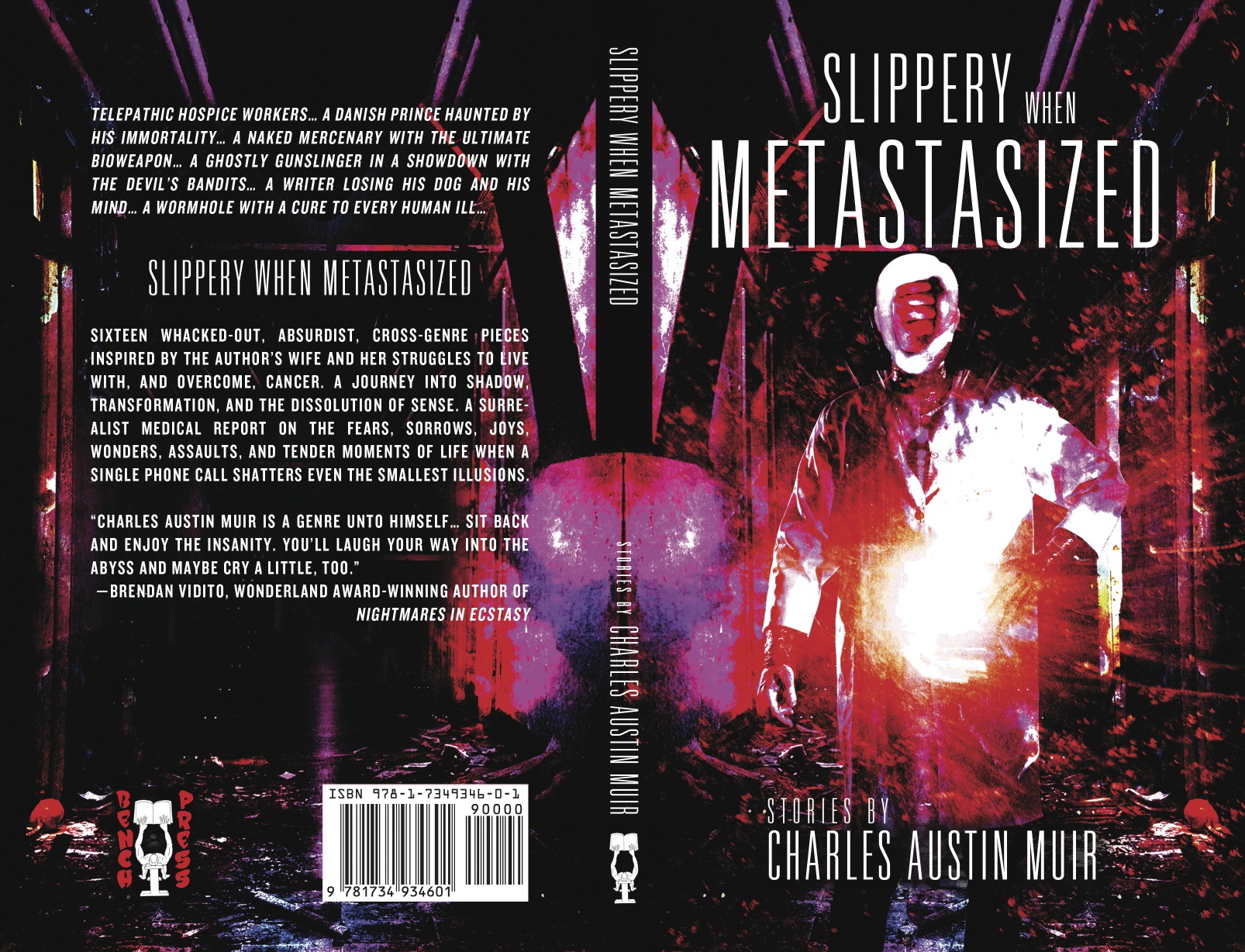 In Slippery When Metastasized, Charles Austin Muir offers stories and prose interspersed with poetry and art, and, while each piece is distinct, the collection is unified by its high-absurdist/surrealist experimentation laced with pop-culture references. It’s a manifesto about how anxiety, confusion, and grief can disrupt reality. It’s also meditation on the fragility and plasticity of bodies, the transitory nature of our health, and the fraught relationship between perception and reality. These works are funny, irreverent, and fast-paced---they revel in their own weirdness. At the same time, there is nothing frivolous about them. Like the best bizzaro/fabulist/absurdist storytelling, Charles Austin Muir pursues something MORE real than “realism”—something that touches on the bewilderment, confusion, and frustrations we all intimately know but can rarely describe. There are real truths in this collection, and the most important of these might be that, despite the strange, ridiculous, illogical conditions that tangle and complicate these characters’ attempts at life, at even the lowest points they remain able to forge kind of meaningful connections to one another, and, it’s through this that this collection of stories about mortality, separation, violence, and chaos can also be a collection of stories about love, optimism, and hope.