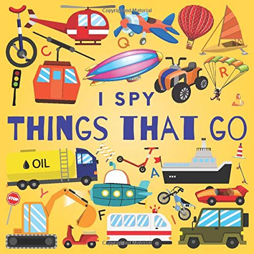 NEW AND IMPROVED !!! This Super Cool " I Spy Things That Go Book for Kids Ages 2-5 " will keep kids entertained for hours. Lots of Fun Colorful Images of over 100 things that go. A cute kid book that teaches the ABC with cars, trucks and other cool things that go. Pages are arranged in Alphabetical order to help your kid recognize letters and relate them to transport and vehicles that they know.