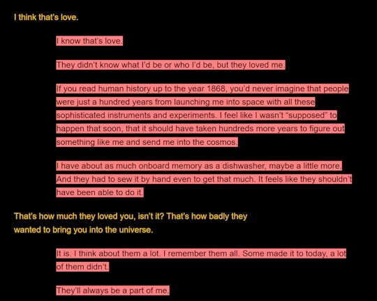 im going to try to insert a pic of one of my favorite quotes because it made me so crazy but idk if itll work? if it does work the context is the red text is a space probe talking about how they were built... yeah image: