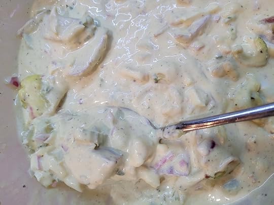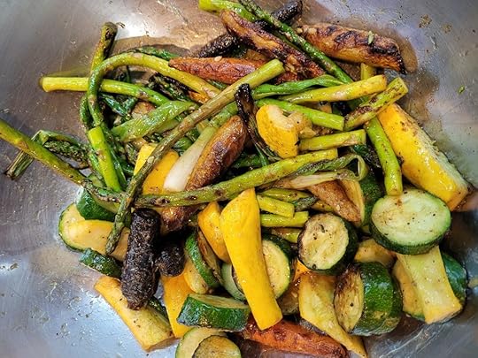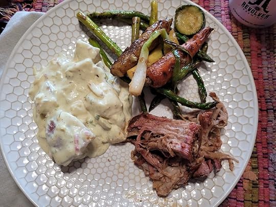 The first meal from the cookbook: Pulled Pork, Roasted Vegetable Salad, and Potato Salad[/caption]