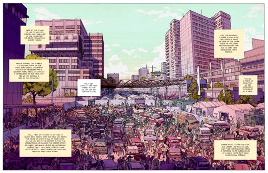 The artwork in the The Fall is beautiful: that detailed, fine-lined European style that I never grow tired of. The backgrounds sing with realism. Which makes it all the harder to fully enjoy the book, since this gorgeous, realistic art is depicting a pandemic-, climate change-, and recession-fueled end to society as we know it. It's basically The Walking Dead with a pandemic instead of zombies.
