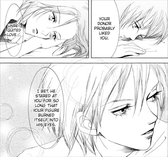 The idea is almost beautiful for a moment and she is dismissive of it until she opens her bathroom door and sees an image of herself naked and showering. It's revealed that her donor didn't just watch her from afar; they took advantage of her blindness to stalk her and watch her everywhere, living inside her home and watching her constantly. Horrified, she claims to hear her eye donor's voice state how now she'll never be able to forget them because they always were watching, suffering with their unrequited love. It leaves off on a sense of relief from the donor, who is satisfied that Kaori at last knows of their feelings, and a sense of complete and utter horror from Kaori, who must live with the eyes of her obsessed stalker and live with the constant evidence of their twisted feelings for her.