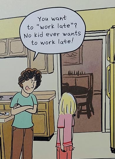 So this book, volume 4, is cute. It takes place the summer Sunny turns 13 (1978 to be exact!) when all her friends have left for family vacations and Sunny is still home in Pennsylvania for the summer, hot and miserable and babysitting her younger brother. She eventually gets a job working the snack shack at the community pool and makes some friends while she's there. It's definitely much more lighthearted then the early books (no drama other than crushes or annoyance at parents) and we get to see Grandpa make a appearance as well as a few postcards from Dale, her big brother who we met in book #1. It's a super cute and fun read as usual but I have to say, Sunny's mom definitely stole the show in this volume. Her exasperation at Sunny ("Clean your room!" "Don't be home late") and her worry over Sunny's burgeoning friendship with Tony ("Why do you have a boy's T-shirt in your laundry?!?!) cracked me up. You could tell it was hard for her to let Sunny have more freedom that summer, even though she did. I really enjoyed that. That is universal between parents and children.
