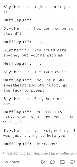 Update 3 *4.5 This has Slytherin x Hufflepuff pairing aka my fav trope!!! I WANT MORE!!!! And Zander is my book boyfriend!!!! It's FINAL!!!!!! The Hero was emotionally constipated AND the main character was the sweetest Puff!!! This ACTUALLY happened in the book☝ Not in the exact same way but something similar *dreamy sigh*