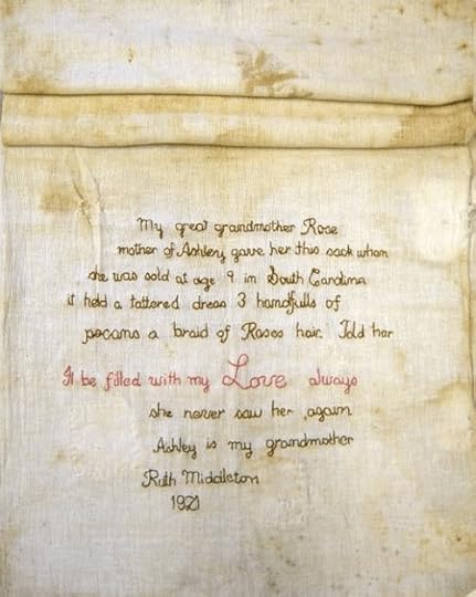 “My great grandmother Rose mother of Ashley gave her this sack when she was sold at age 9 in South Carolina it held a tattered dress 3 handfulls of pecans a braid of Roses hair. Told her It be filled with my Love always She never saw her again Ashley is my grandmother Ruth Middleton 1921”