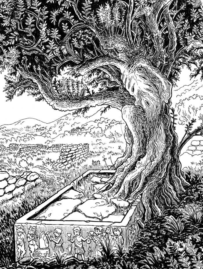 "A un extremo de la tumba, con sus peculiares raíces desplazando los bloques de mármol del Pentélico, mancillados por el tiempo, crece un olivo antinaturalmente grande y de figura curiosamente repulsiva; tanto se asemeja a la figura de un hombre deforme, o a un cadáver contorsionado por la muerte, que los lugareños temen pasar cerca en las noches en que la luna brilla débilmente a través de sus ramas retorcidas" 3.5* Nos situamos en la antigua Grecia. Un extraño árbol que crece alrededor de una tumba de mármol. El árbol es particularmente gigantesco, y con una peculiar forma que se asemeja a la de un hombre deformado. Algunos creen que es uno de los parajes predilectos del temible Dios Pan. Pero un anciano que vive en una cabaña en las cercanías le contó una historia diferente a nuestro narrador... Una historia sobre los escultores Kalos y Musides que aceptaron un encargo de un tirano local.