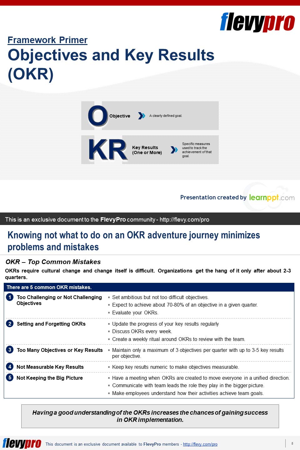 This is a business presentation on Objectives and Key Results (OKR). It is a part of a series of presentations on various business frameworks, designed in the same style of management consulting presentations (e.g. McKinsey, Bain, BCG, Deloitte, Accenture, Capgemini, IBM). Each presentation addresses a unique management topic. Successful organizations are using Objectives and Key Results (OKR) now. OKRs are efficient way to track company and team goals and measure their progress. It helps every organization's success by cutting out unimportant goals and focusing on what truly is important within the organization. OKR is a framework for defining and tracking objectives and their outcomes. OKRs has been seen as a way to communicate so that there is clarity of purpose. It is also a tool for motivating and aligning people to work together. It increases transparency, accountability, and empowerment. This presentation provides organizations, teams, and employees an in-depth understanding on the Objectives and Key Results (OKR) Framework. The OKR Framework is comprised of 2 important 1. Objectives 2. Key Results The goal of OKR is to define how to achieve objectives through concrete, specific, and measurable actions. Having a good understanding of OKR will guide companies and teams to better focus on what is important and connect work at every level to the most important goals. OKRs are best shared across the organization. They provide teams with visibility of goals leading to alignment and focus effort. The ebook also includes some slide template examples you can incorporate into your own business presentations.