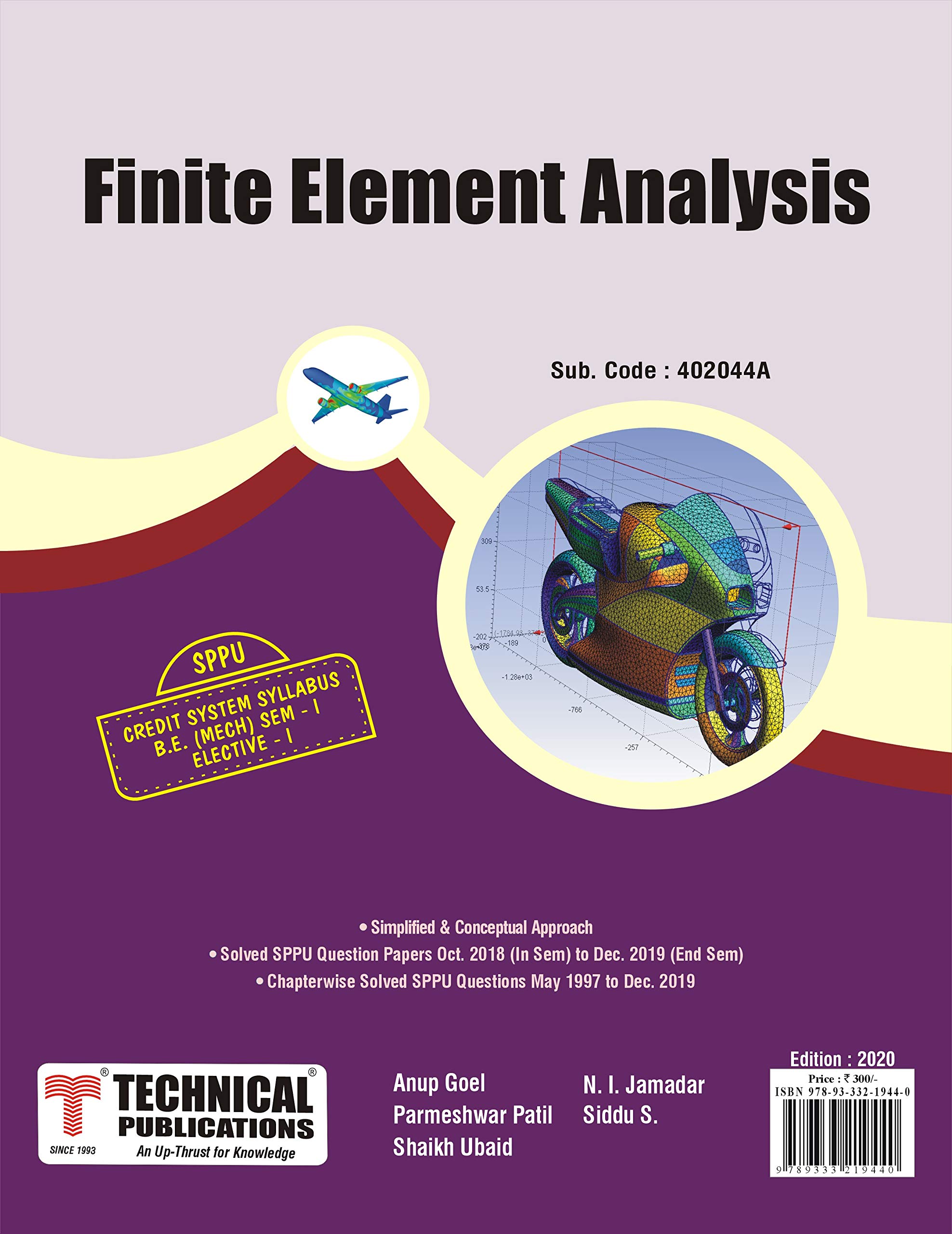 UNIT 1: Fundamental Concepts of FEA Solution methodologies to solve engineering problems, governing equations, mathematical modelling of field problems in engineering, discrete and continuous models. Brief history of FEM, Finite Element terminology (nodes, elements, domain, continuum, degrees of freedom, loads & constraints), general steps involved in FEM, applications of FEM in various fields, advantages and disadvantages of FEM, consistent units system, essential and natural boundary conditions, symmetric boundary conditions. Introduction to different approaches used in Direct approach, Variational formulation- Principal of Minimum Potential Energy (PMPE), Galerkin weighted residual method, Principle of Virtual Work, Rayleigh-Ritz method, relation between FEM and Rayleigh-Ritz method. Types of Analysis (Introduction): Linear static analysis, Non-linear analysis, Dynamic analysis, Linear buckling analysis, Thermal analysis, Fatigue analysis, Crash analysis. (Chapter - 1) Unit 2: 1D Elements Types of 1D elements, displacement function, global and local coordinate systems, polynomial form of interpolation functions- linear, quadratic and cubic, properties of shape function, primary and secondary variables. Formulation of elemental stiffness matrix and load vector for bar, truss and beam using any approach, Formulation of load vector due to uniform temperature change (only for bar). Assembly of global stiffness matrix and load vector, properties of stiffness matrix, half bandwidth, treatment of boundary conditions- elimination approach, stress and reaction forces calculations. (Chapter - 2) Unit 3: 2D Elements Two-Dimensional Stress Plane Stress/Strain problems in 2D elasticity, constitutive relations Constant Strain Triangle (CST), Liner Strain Rectangle (LSR), displacement function, Pascal‘s triangle, compatibility and completeness requirement, geometric isotropy, convergence requirements, strain filed, stress filed, Formulation of element stiffness matrix and load vector for Plane Stress/Strain problems. Assembly of global stiffness matrix and load vector, Boundary conditions, solving for primary variables (displacement), stress calculations. (Chapter - 3) Unit 4: Isoparametric Elements and Numerical Integration Concept of isoparametric elements, Terms isoparametric, super parametric and subparametric. Coordinate Natural coordinates, Area coordinates (for triangular elements), higher order triangular and quadrilateral elements (Lagrangean and serendipity elements), geometry associative mesh, quality checks, mesh refinement- p vs h refinements, Uniqueness of mapping - Jacobian matrix. Numerical Gauss Quadrature in one and two dimension, Order of Gauss integration, full and reduced integration, sub-modeling, substructuring. (Chapter - 4) Unit 5: 1D Steady State Heat Transfer Problems Introduction, One dimensional steady-state heat transfer problem- Governing differential equation, Finite Element formulation using Galerkin’s approach for composite wall and thin Fin , essential and natural boundary conditions and solving for temperature distribution. (Chapter - 5) Unit 6: Dynamic Analysis Types of dynamic analysis, general dynamic equation of motion, lumped and consistent mass, Mass matrices formulation of bar, truss and beam element. Undamped-free Eigen value problem, evaluation of eigen values and eigen vectors (characteristic polynomial technique). (Chapter - 6)