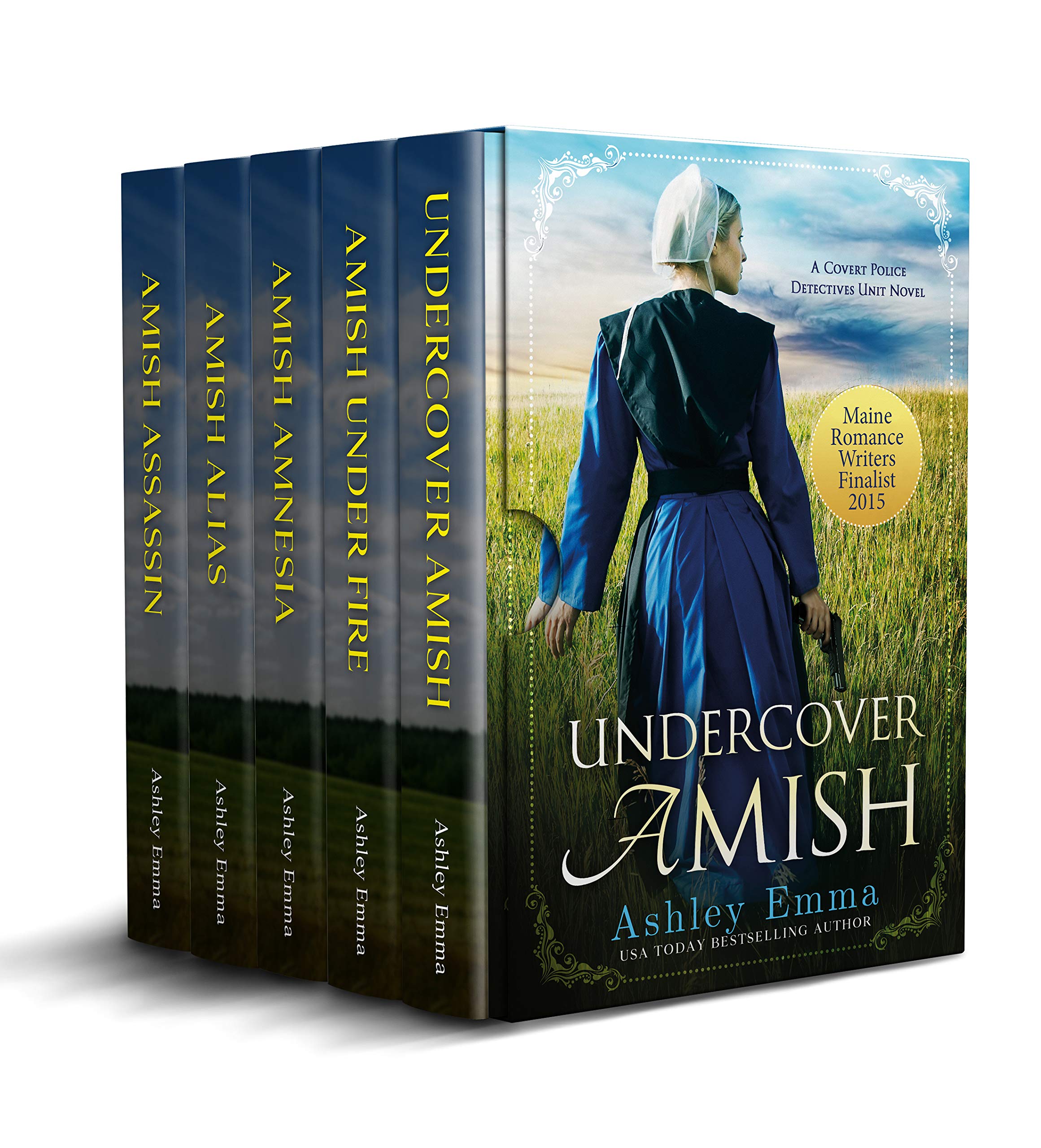 7 full-length novels and 1 novella to read to your heart's content!USA TODAY BESTSELLING AUTHOR Escape to the Amish community of Unity, Maine with these clean romance novels where life is not as quaint and simple as it seems. This set is too long to be a paperback, so please search for Ashley Emma on Amazon if you prefer paperbacks.UNDERCOVER AMISH Detective Olivia Mast would rather run through gunfire than return to her former Amish community in Unity, Maine, where she killed her abusive husband in self-defense. After an Amish man is murdered, she heads to Unity to investigate undercover. To make things even worse, her captain also orders her to protect the man she dated as a Isaac Troyer. (Undercover Amish was a finalist in the 2015 Maine Romance Writers contest.)AMISH UNDER FIRE After Maria Mast’s abusive ex-boyfriend is arrested for sex trafficking, she thinks she can safely return to her Amish community. When someone begins stalking her, Agent Derek Turner goes with her as her undercover bodyguard, but will his growing feelings for her distract him? (Semi-finalist in Harlequin's So You Think You Can Write Contest in 2015.)AMISH AMNESIA Kidnapped. Starved. Hit by a car and left for dead. And she couldn't even remember her own name. When Afghanistan veteran Jefferson Martin witnesses a young woman being hit by a car near his campsite, all thoughts of vacation vanish as the car speeds off. When the malnourished, battered woman wakes up, she can't remember anything before the accident. They don't know her name, so they call her Jane. The more Jefferson falls for her, the more persistent the stalker becomes in making Jane miserable…and in taking her life. AMISH ALIAS Threatened. Orphaned. On the run. With no one else to turn to, these two terrified sisters can only hope their Amish aunt will take them in. But the quaint Amish community of Unity, Maine, is not as safe as it seems. Elijah Hochstettler, the handsome farmhand, grows closer to Charlotte as she digs up dark family secrets that her mother kept from her, and soon she realizes someone inside the community wants her gone.ESTHER'S AMISH SECRET (a novella)When Esther sneaks out to visit her sister who left the Amish, something terrible happens to her in the city. When the two sisters have a devastating disagreement, will they find a way to make amends?AMISH ASSASSIN When nurse Anna Hershberger finds a man with a bullet wound who begs her to help him, she has no choice but to go on the run with him after an assassin attacks them. This handsome stranger, who says his name is Connor, says his mission is to shut down a local sex trafficking ring targeting Anna's former Amish community in Unity, Maine, and he needs her help most of all. AMISH ACCIDENT While driving, Freya Wilson accidentally hits an Amish man with her car in a blizzard, instantly killing him. Panicked, she leaves him there in the road and drives away, afraid that if she is arrested, her violent ex will locate her using his connections with the police...and kill her. Will the Amish man's brother, who left to become a police officer, ever forgive her?AMISH IDENTITY After surviving human trafficking, Alexis gets a second chance at life. After losing her husband and moving with her daughter to live with her Amish in-laws, she meets Agent Ben Banks who helped rescue her a few years ago.