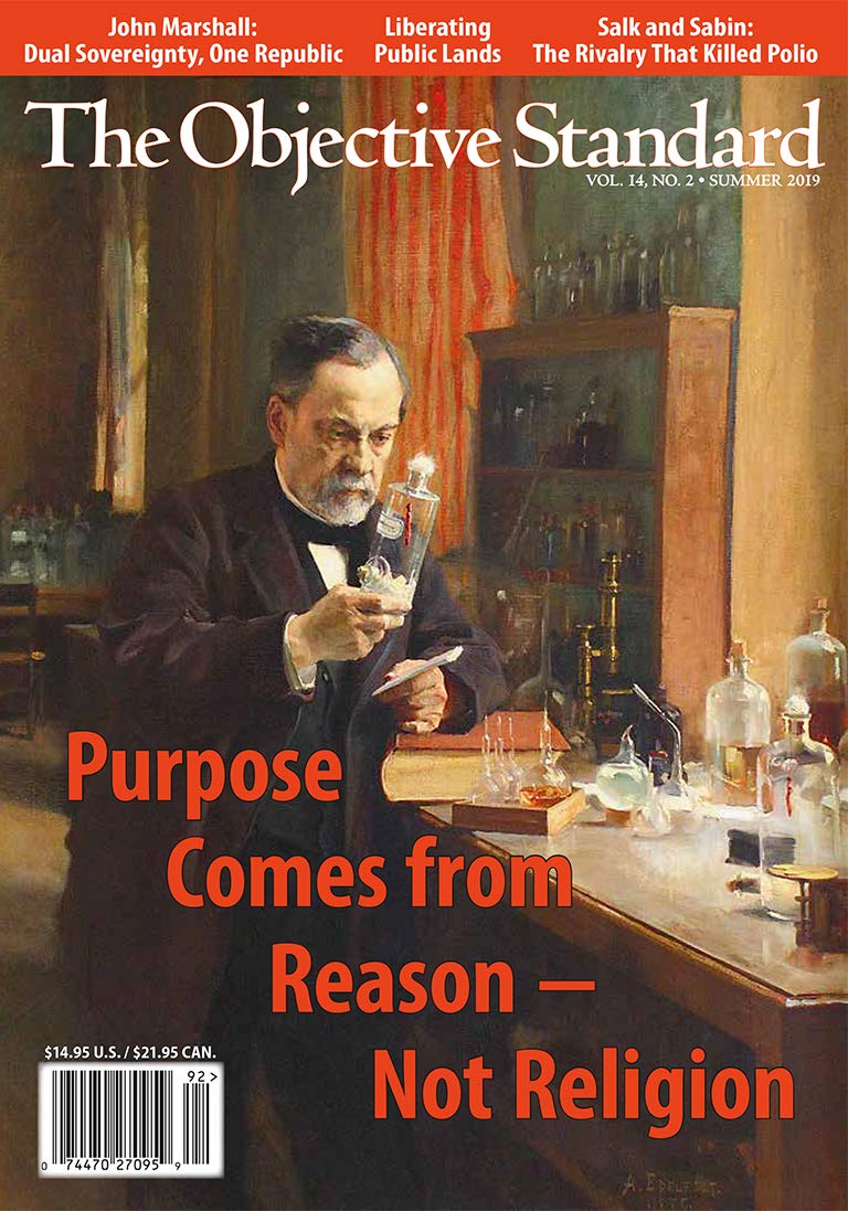 • Purpose Comes from Reason, Not Religion by Craig Biddle • John Marshall: Dual Sovereignty, One Republic by Timothy Sandefur • Liberating Public Lands by Jon Hersey • John Gillis on Romantic Realism in Architecture, interviewed by Stephanie Bond • How Wine Appreciation Can Enrich Your Life: An Interview with Adam Edmonsond, interviewed by Jon Hersey • Salk and Sabin: The Rivalry That Killed Polio by Tim White • How Jamie Dimon Should Have Answered Representative Katie Porter by Michael Dahlen • Flying Is Safer Than Eating by Timothy Sandefur • The Hard-Won Wisdom of a Former Bigot by Jon Hersey • John Locke and Natural Philosophy by Peter Anstey, reviewed by Jon Hersey • Essentialism: The Disciplined Pursuit of Less by Greg McKeown, reviewed by Jonathan Townley • Enlightenment Now: The Case for Reason, Science, Humanism, and Progress by Steven Pinker, reviewed by Timothy Sandefur • Leonardo Da Vinci by Walter Isaacson, reviewed by Joseph Kellard
