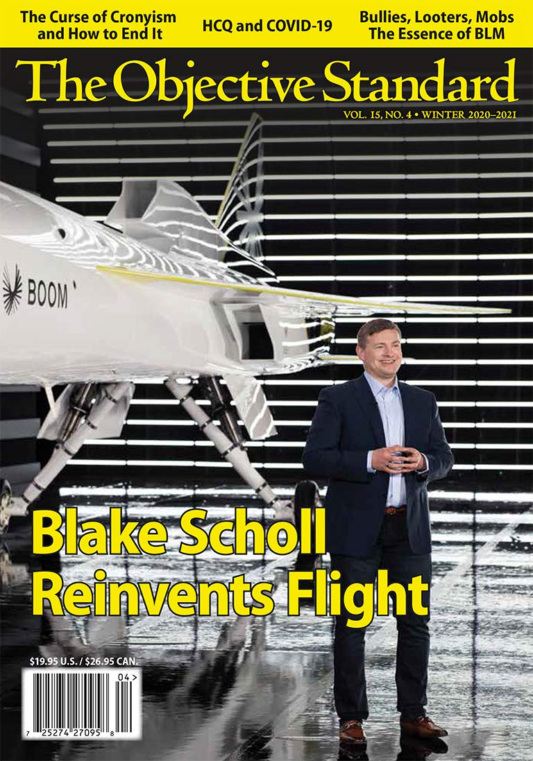 The Winter 2020 issue (Vol. 15, No. 2) features the following articles, shorts, and Reinventing An Interview with Blake Scholl by Jon HerseyCorporations and Political The Curse of Cronyism and How to End It by Michael DahlenEx-Muslims on the Front Lines in the Battle for Civil Society by Faith QuinteroHCQ and What Does the Evidence Show? by Steven KornweissThree Symphonies to Help You Triumph by Leisa HartFive Phenomenal Long-Form Rock Songs by Thomas WalkerLife in No-Lockdown Sweden by Thomas WalkerSweden Hasn’t ‘Failed Its People,’ It Has Protected Their Rights by Thomas WalkerBullies, Looters, The Anti-American Essence of BLM by Aaron BrileyWe Can’t Fight Racism by Engaging in Racism by Aaron BrileyThe Assault on Rideshare Companies and Drivers by Maggie BirdThe Pattern Day Trader Rule Hinders Financial Independence by F. F. MormanniThe Immorality of Universal Basic Income by Angelica WerthThinking Critically about Climate Change by Joseph KellardHow Travel Can Foster a Personal Renaissance by Joseph KellardCynical How Activist Scholarship Made Everything about Race, Gender, and Identity—and Why This Harms Everybody by Helen Pluckrose and James Lindsay, reviewed by Timothy SandefurThe Property Mine, Yours, and the Human Mind by Bart J. Wilson, reviewed by Timothy SandefurFacets of Ayn Memoirs by Mary Ann Sures and Charles Sures, reviewed by Jon HerseySpotlight by Tom McCarthy and Josh Singer, reviewed by Tim WhiteBlazing Saddles, Directed by Mel Brooks, reviewed by William NauenburgMulan (2020) Sullies the Legacy of a Heroine, by Frank OlechnowiczThe Death of Stalin by Armando Iannucci, reviewed by Thomas WalkerThe Objective Standard is a quarterly journal of culture and politics written from an Objectivist perspective (Objectivism being Ayn Rand’s philosophy of reason, egoism, and laissez-faire capitalism). The journal is based on the idea that for every human concern—from personal matters to foreign policy, from the sciences to the arts, from education to legislation—there are demonstrably objective standards by reference to which we can assess what is true or false, good or bad, right or wrong. The purpose of the journal is to analyze and evaluate ideas, trends, events, and policies accordingly. We maintain that the standards of both knowledge and value derive from the facts of reality; that truth is discovered only by means of reason (i.e., through observation and logic); that the factual requirements of man’s life on earth determine his moral values; that the selfish pursuit of one’s own life-serving goals is virtuous; and that individual rights are moral principles defining the fundamental requirements of a civilized society. We stand opposed to the notion that the standards of knowledge and value are not factual but subjective (feeling-based) or other-worldly (faith-based); that truth is ultimately dictated by majority opinion or a “supernatural” being’s will; that democratic consensus or “God’s word” determines what is moral; that sacrifice for “the common good” or in obedience to “God’s commands” is virtuous; and that rights