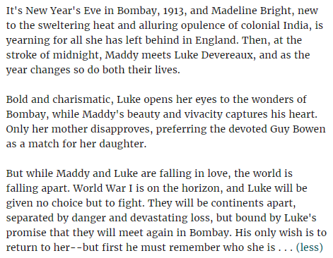 Let’s think. What should our plot be? A forbidden love story with WWI looming on the horizon? Nah, that’s overused. Hmmm, I know! A forbidden love story with WWI looming on the horizon in Bombay! Properly exotic and dreamy.