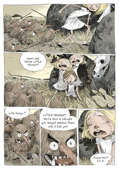 What a bummer. I've read two other graphic novels from Tony Sandoval and adored both of those, so I was really hoping we could go 3/3 on this one, but nope. There are too many little plot threads that never quite felt like they belonged together, and despite the nonstop action and a healthy dose of oddity, the plot kept losing my interest and I had to drag myself through the ending. I'm also a little uncomfortable with full-frontal nudity and some generally sexual scenes revolving around a character whose age is never explicitly identified, but who seems very much to me to be pre-teen or very early teens at most (mainly based off of her attitude, the evident ages of her peers, and a comment she makes having recently started to develop breasts). I dunno - aside from Sandoval's beautiful art style, this whole book was sadly quite a miss for me.