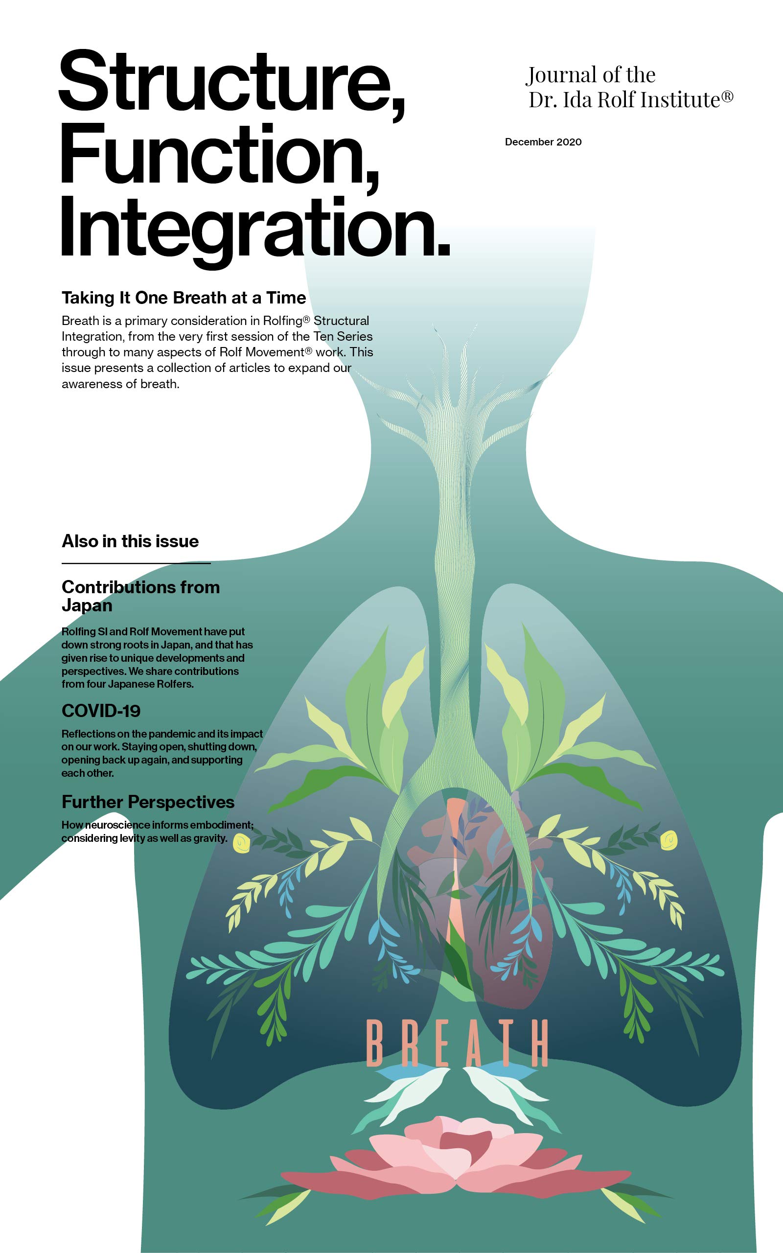 The December 2020 issue (Volume 48, No. 2) of Structure, Function, Journal of the Dr. Ida Rolf Institute® has a theme of Taking It One Breath at a Time. Breath is one of the foundational concerns of Rolfing® Structural Integration (SI), and articles in this issue focus on how to apply technical, movement-based, and poetic knowledge of breath into our Rolfing practices. Also, since COVID-19 has changed all our lives, there are articles regarding how the Rolfing community is adapting to times of shutdown, working with clients online, and adapting to working with new public health standards. Our second theme is a collection of articles from Japanese Rolfers including the intersection between acupuncture and Rolfing work, regional considerations, and an exploration of tension and gravity as it relates to bone and the brain. The issue also features an interview with Michael Polon on the neuroscience of sensation and embodiment and an appeal to bring the concept of levity into our work.