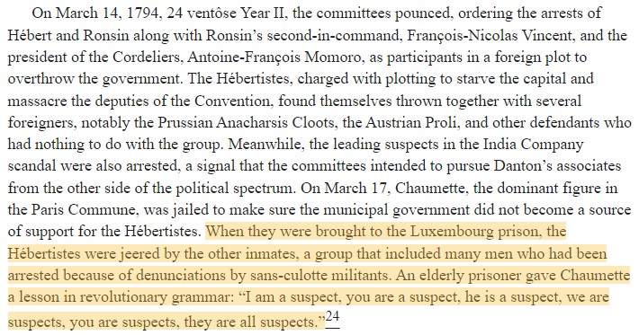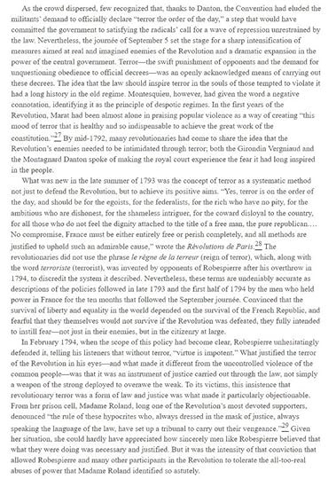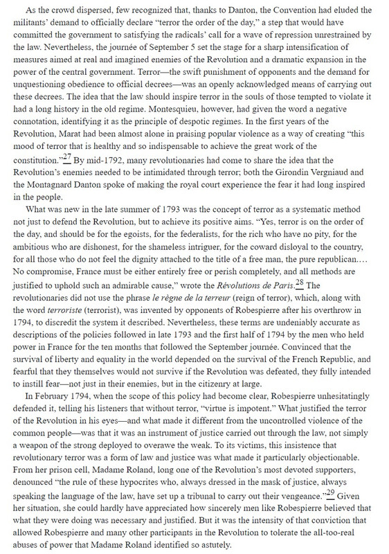 ‘’[Robespierre] never indulged in the open advocacy of bloodshed….. But he justified such violence as inevitable and necessary if the goals of the revolution were to be achieved…. But he was a gifted politician, capable of sizing up the forces at work in complicated situations.’'