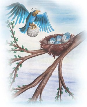 We see a bird intercept a ball and place it in a nest full of eggs.