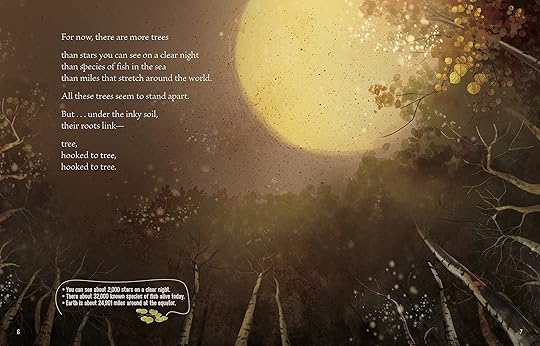 This book is absolutely beautiful. A perfect mix of poetic text, gorgeous illustrations, and factual information is a win-win all around. As I read, I felt as if I were in the middle of this amazing cloning phenomenon of Aspen trees. It takes a special writer to pull a young reader into non-fiction, and Ms. Fox has done that brilliantly. The lovely illustrations by Turine Tran perfectly complement the text, and for a while, the reader is not reading facts but is experiencing wonder. There are so many layers to this book including a call to action to help protect Pando. I highly recommend this book.
