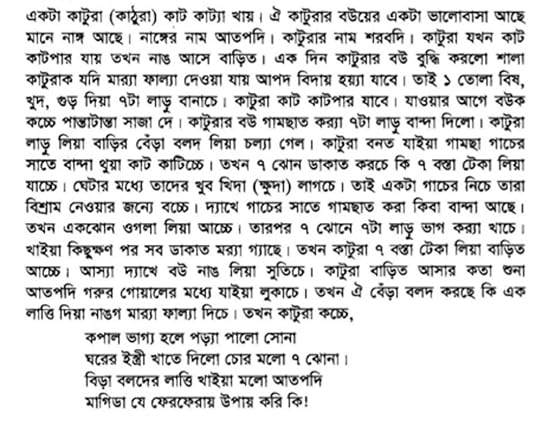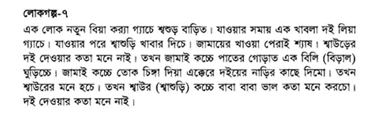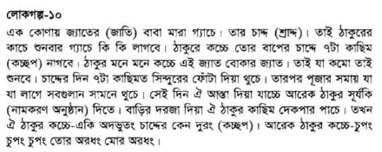 খাঁটি বগুড়ার ভাষায় বলে যাওয়া গল্পগুলোর লিখিত রূপ পাবেন এখানে। সুতরাং গল্পের প্রকৃত চেহারা, বা অন্তর্নিহিত রসবোধ— যা ই বলেন, অটুট রয়ে গেছে সব। কয়েকটা পড়ে খ্যাঁকখ্যাঁক করে হেসেছি অনেকক্ষণ। যেমন: কিংবা আর দাম্পত্যের গালগল্প তো আছেই: এর সাথে গোছানো ভাবে লেখা চাঁদ সওদাগরের বাড়ি, বেহুলার বাসরঘরের ইতিহাস। মাদারপীরের অলৌকিক গল্প। কিঞ্চিৎ অশ্লীল কিঞ্চিৎ শ্লীল লোকছড়া। সব মিলিয়ে বইয়ের এই অংশটা সবচেয়ে উপভোগ্য ছিল, অনেক বেশি সময় নিয়ে পড়েছি।