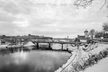 View of the Narva River on the border between Estonia and Russia viewed from the North. Ivangorod Castle (Russia) can see seen on the left and Hermann Castle (Estonia) can be viewed on the right. Photograph by Carlos Spottorno for Panos UK. Image sourced from Panos.Co.UK.